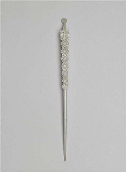 白玉耳挖簪,簪首陰刻一蝶紋與六朵六瓣小花,尾端陰刻如意雲紋,尖細鋌,全器潔白。