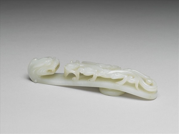 白玉帶鉤,器身細長,面高浮雕螭龍,背啄一鈕,玉色潔白溫潤。