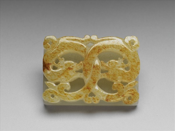 白玉帶頭,矩形,面高浮雕夔龍一對,背啄二鈕,器面沁褐斑。