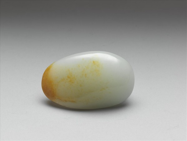 鵝卵形白玉帶頭,面平滑,被啄二鈕,面部沁褐斑。