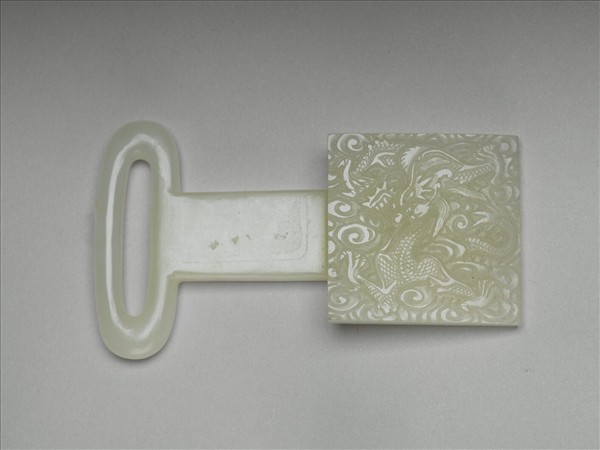 白玉帶頭,器身左側為橢圓形環,右側之面部陰刻雲龍紋,玉白無雜質。