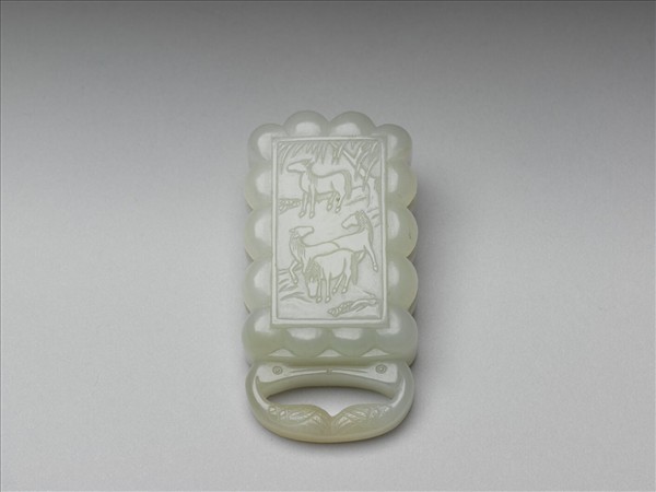 白玉帶頭,器身略呈矩形,底部為環,面中空,可供繩帶穿繫。面部陰刻四馬圖,四周雕成連珠狀,玉白無雜質。