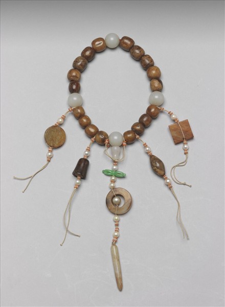 手串,以十八顆褐色玉珠串成,間飾四顆白色碧璽,串首作成葫蘆形。珠間繫五條墜飾,以黃絲帶串翠玉金剛杵、玉環和笈形玉墜為中心,兩旁各有紅褐雲紋方形玉佩墜飾、紡錘形褐綠色墜飾、土褐色鐘形墜飾和紅褐雲紋圓形玉佩墜飾四條。