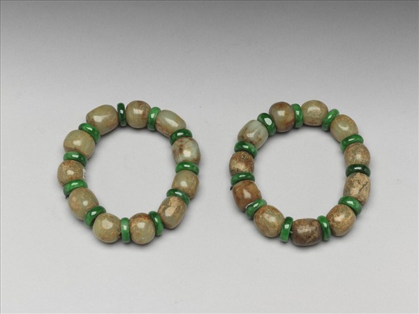 一對玉蓮子鐲,共二十二顆,沁黃褐色斑,間托翠玉環為飾。