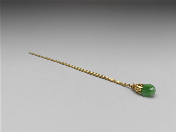 首作蓮瓣座子,鑲水滴形翠玉珠,鍍金挺,前端以金工作菱格紋,似翻轉紋樣。
