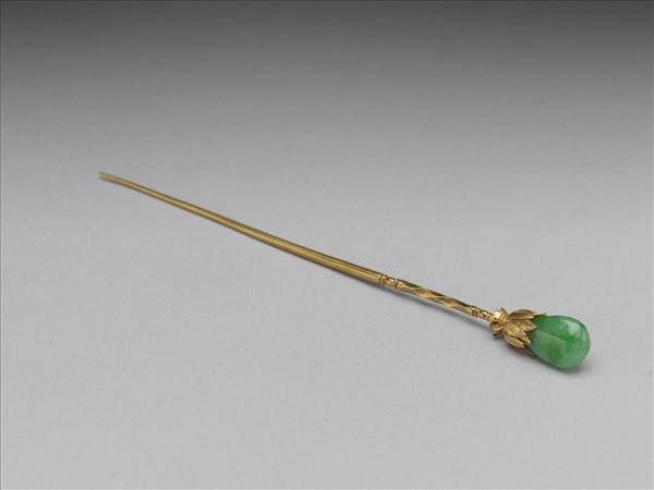 首作蓮瓣座子,鑲水滴形翠玉珠,鍍金挺,前端以金工作菱格紋,似翻轉紋樣。