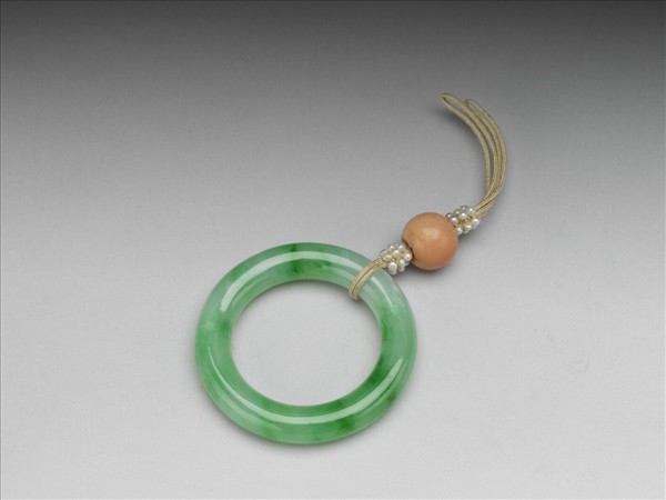 環佩,翠玉,色澤青翠透亮,上繫黃絲線串珊瑚珠和緝米珠。
