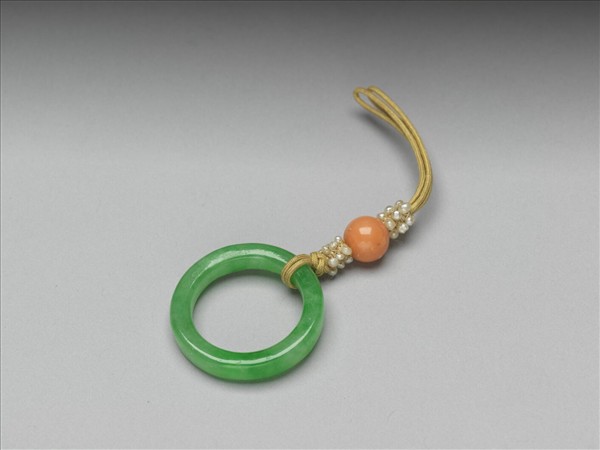 翠玉環,繫黃縧,上飾白米珠及珊瑚珠一。
