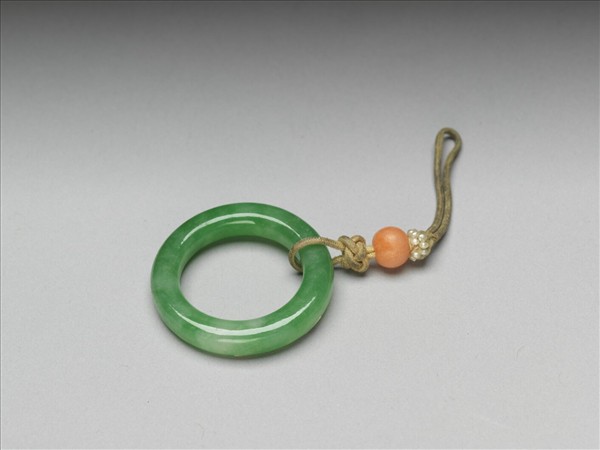 翠玉環,繫黃縧,上飾白米珠及珊瑚珠一。