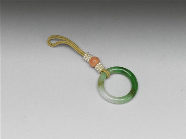 翠玉環,繫黃縧,上飾白米珠及珊瑚珠一。