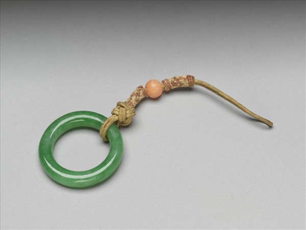 翠玉環,繫黃縧,上飾編織卍字紋及珊瑚珠一。