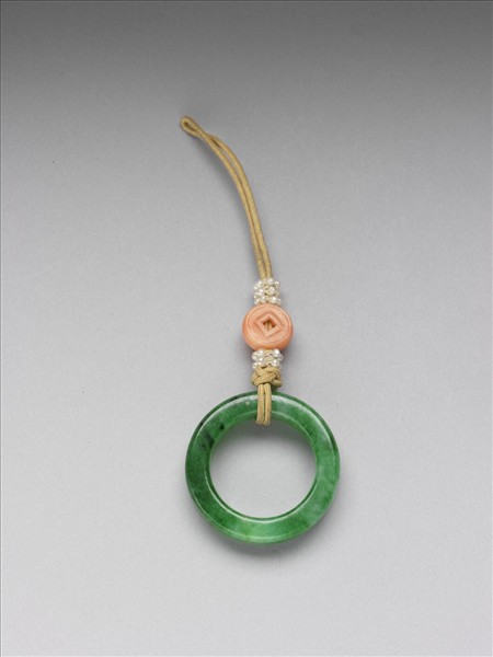 翠玉環,繫黃縧,上飾白米珠及雕珊瑚錢紋一。