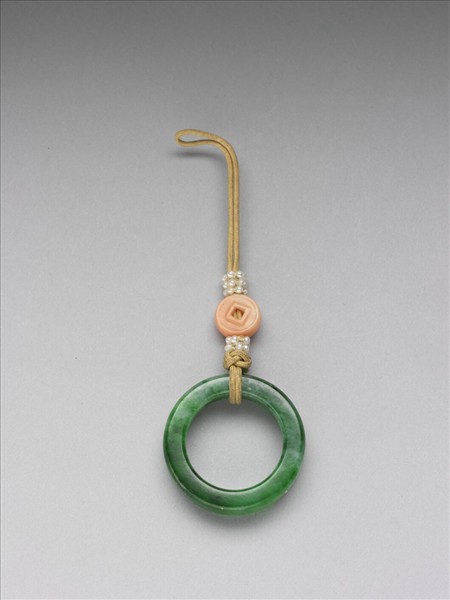 翠玉環,繫黃縧,上飾白米珠及雕珊瑚錢紋一。