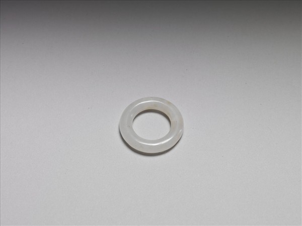 玉質,環形器,全器光素無紋,質地白,略雜有淡赭斑,器面光澤瑩潤。