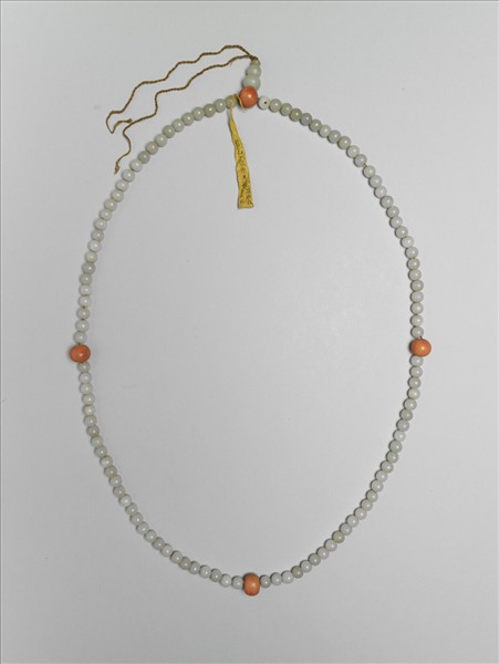 以褐色棉線串白玉數珠計一百零八顆,每隔二十七顆加入一珊瑚珠佛頭,亦以白玉為佛頭塔,呈現樸素典雅之感。