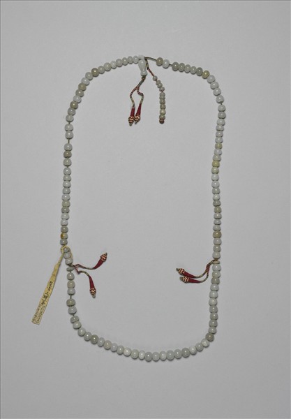 玉珠計一百零九顆,另有佛頭塔一。記捻一串貫十粒玉珠、扁玉珠二,佛頭塔與二扁玉珠處各垂兩流蘇。