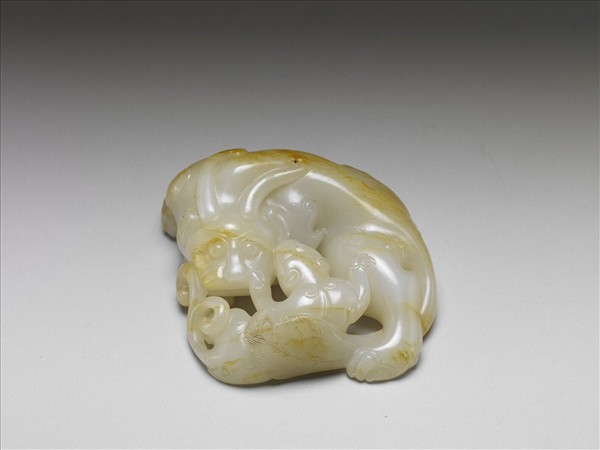 玉石,帶黃色雜斑。全器雕琢成兩個身體蜷曲,相互對望之異獸,一獸體型稍大,身軀壯碩,頭帶雙角,雙眼圓睜,表情生動,尾部毛髮雕飾細膩,捲曲壓於左後腿下方。另一獸呈側身捲曲姿勢,體型嬌小,面部與另一獸相貼,前足亦攀附其上。