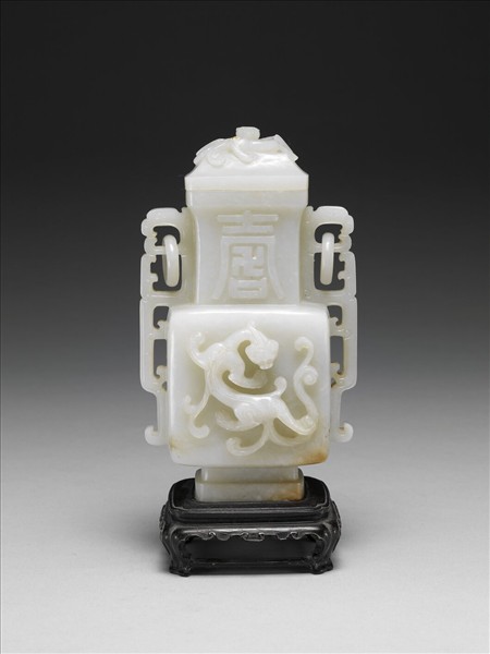 玉質,帶些許黃斑。全器雕琢成一壺,此壺為方形口,長方形頸,雙龍形耳,雙耳各帶一環,方腹,雙階式足,帶蓋。頸部正、反面浮雕一「壽」字,腹之正、反面浮雕一側身回首之螭虎。蓋頂浮雕紋飾。帶一木座,座下有「乙」字。座為長方几式,桌緣邊飾幾何紋,四足間有一橫槓相連。