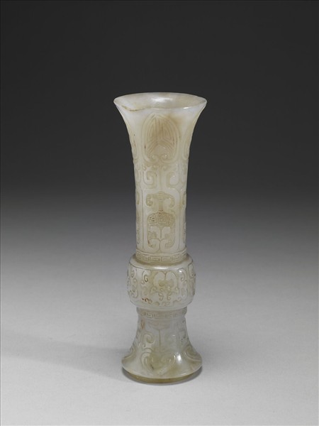 玉質,夾帶黑與赭斑。全器雕琢成仿青銅器之觚造型,微撇口,長直頸,鼓腹,高撇足。脰部以回紋填地,陰刻蕉葉紋、獸面紋,腹飾獸面紋,足為回紋與幾何紋。帶木座。