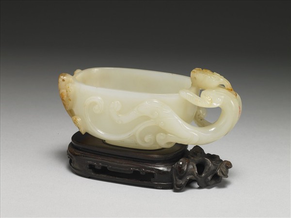 玉夾黃褐斑。全器琢成一長橢圓形杯,深壁,平底,橢長方形圈足。一端立雕一螭虎,螭首下巴壓於器口之緣,四肢與長尾攀附器身,形成器把。另一端高浮雕一全身貼附於器壁之螭虎,螭背滿布褐色沁斑。帶木座。