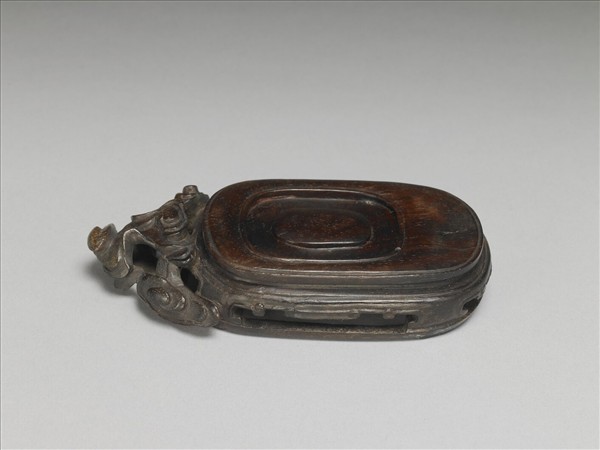 深棕色長方形木座,一端鏤雕成數個相互堆疊之靈芝,器面光素無紋。底部帶四矮足,邊緣刻成幾何紋飾,四足之間有一欄將其連接起來。本器為故玉008812玉螭把杯之木座。