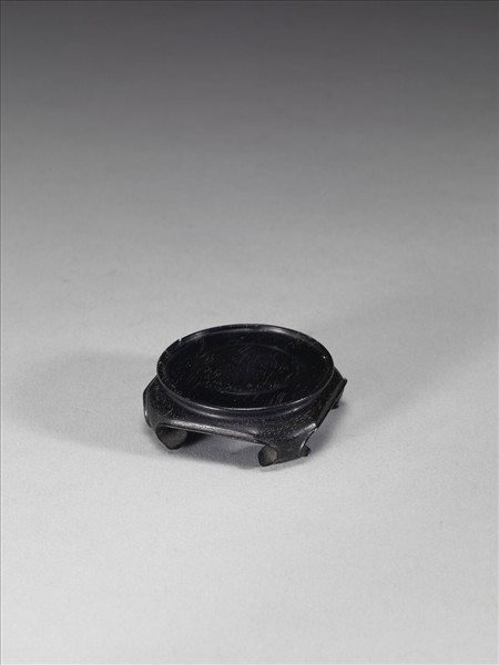 深棕色方形几式木座,上層為一圓盤,下層帶四矮足,足底朝內捲起。表面光素無紋。底部中央有一「乙」字。本器為故玉008813玉觚之木座。