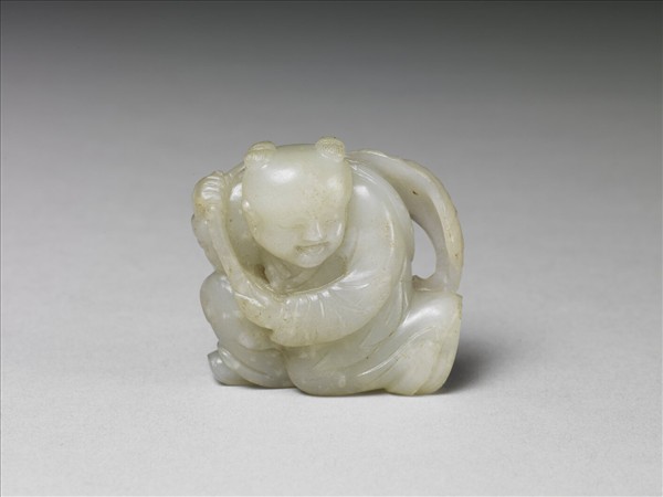 玉質,多處帶黑與白色雜斑。全器雕成一蹲跪姿孩童,梳雙髻,頭向左側望,臉上表情歡暢,雙手持握一蕉葉,葉身橫過右肩,展開披覆於背後。人物周身光滑圓潤,服飾皺摺處與細部皆雕刻簡潔俐落之線條。本器與其他四件玉器(故玉8814N1-8814N3、8814N5)同置一玉雲龍紋方盒中。