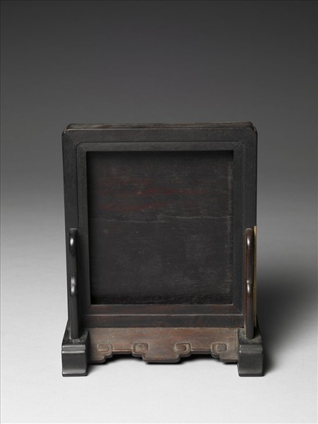 深棕色木座。方形邊框一面平素可供鑲嵌玉器,另一面陰刻填金乾隆御製詩文:「土華浸骨蔚斑然,成珮以來弗計年。設曰炎劉猶頓置,便稱忠夏想誰先。命夔典樂堪擊石,贈董安于當佩弦。撫不手留暎心謐,卻慚體物屢成篇。 乾隆乙巳(五十年,1785)御題」,帶兩鈐印「古稀天子」、「猶日孜孜」。底座雙面邊緣皆飾幾何圖案。本器為故玉008818玉戚之木座。