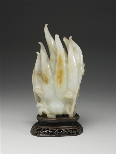 玉質局部沁染,立雕一佛手柑,兩側飾有枝葉。附鏤雕卷葉紋足木座一只。
