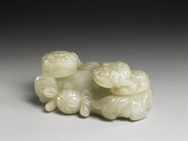 玉質,立雕三獅與繡球,再以陰線刻雕飾細部表情、毛髮線條。本作品以三獅戲球為主題,大獅側躺,一足搭於繡球上,一隻小獅伏立在大獅身上,頭向前伸,欲戲球狀,另一隻小獅在大獅尾側,向上頂上方的小獅。附拐子龍紋足木座一。