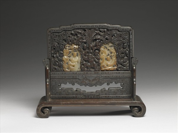 木雕插屏,嵌有明代鏤雕童子紋玉片二塊。兩側之木雕搭配玉雕, 合組為九子嬉游庭園竹石蕉陰間之嬰戲圖。木座下方鐫有填金隸書乾隆十九年(1754)御製詩:「七情之發真惟孩,童子嬉戲良可咍,以手捫目臨虛階,蕉陰竹蔭青雀嵬,玉人抱璞雕奇瓌,睢睢于于意自佳,蒙叟所謂天全哉。乾隆甲戌秋御題」。並鈐有「乾」、「隆」二印。