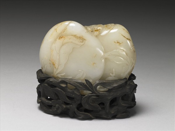 玉質,立雕雙桃及枝葉,桃上還有一淺浮雕蝙蝠,表福壽之意。附鏤雕桃枝木座一只。