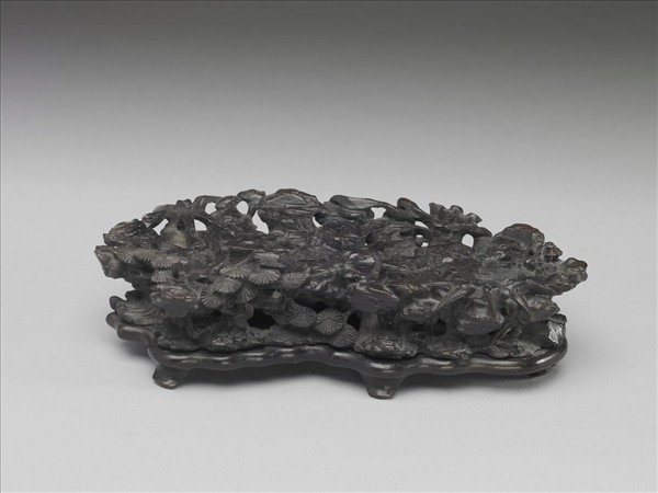 木質,座隨器形,座面鏤雕松、竹、梅歲寒三友及山石,座底有五足。