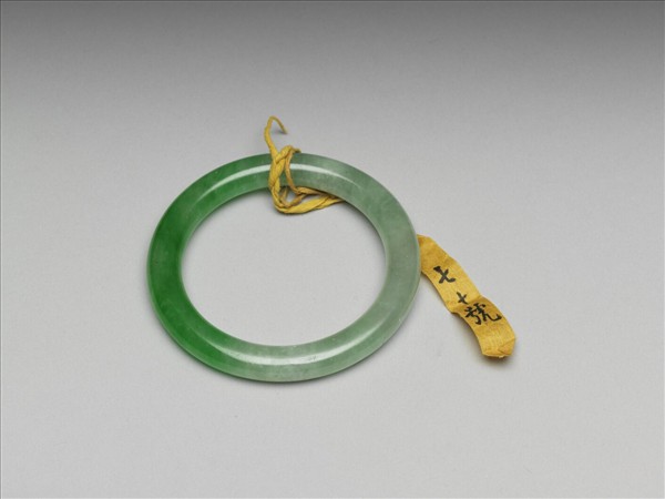 翠玉手鐲,灰白、綠色相混,半透明質地。全器光素無紋,打磨細緻,帶瑩潤光澤。