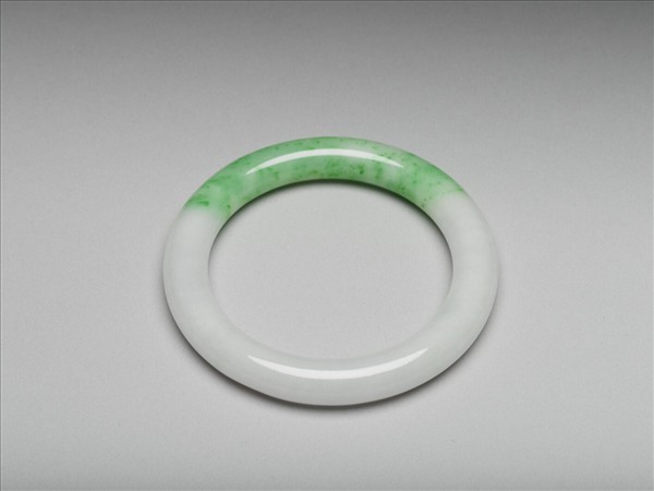 翠玉手鐲,白綠色相混,不透明質地。全器光素無紋,打磨細緻,帶瑩潤光澤。