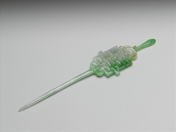 翠玉耳挖簪,一端鋌扁長,一端為長勺形耳挖。翠玉白綠色相混,質地緻密,帶玻璃光澤,簪首雕鏤空雙喜,囍字減地突起邊框,使字有立體效果,其上下各刻一隻蝙蝠,寓意「雙喜雙福」。