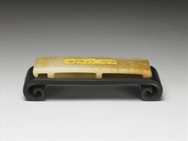 玉質、略呈褐色。下方可見具有獸眼及雙眉的獸面(劍璏實際使用時獸面應朝上),由下至上則以重複的紋飾單元鋪列器身,勾勒出簡化的獸身背脊,這是西漢中期至東漢常見的紋飾設計模式。劍璏由其平整底面和劍鞘貼合綁縛,同玉劍首、玉劍鐔(劍格)及玉劍摽(劍珌)為玉具劍完整的組件之一,是彰顯貴族身分地位的禮儀用具。