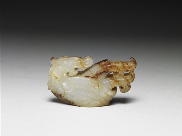 全器雕為一夔鳳,龍首鳳身,回首張嘴如正吼叫,赭斑有一大部分集中於尾部羽毛處,似是工匠巧妙利用赭斑的設計,鳥腹底部有圓形凹入,或正顯示本器原為裝附于圓柱狀物之上,有如手杖頂端的裝飾。附木座。