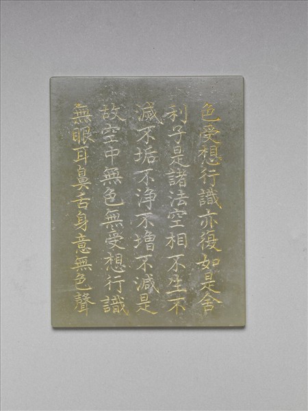 長方形玉版,一式四件(故玉9113-9116),上刻錢汝誠(1722-1779)所書〈般若波羅蜜多心經〉填金楷字。本器為玉版中的第二片,續刻「般若波羅蜜多心經」之中段經文。