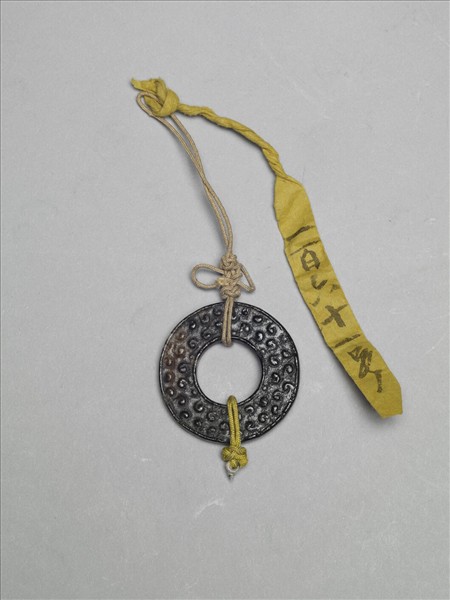 玉系璧色澤深褐近黑色,厚度薄,中間有一大孔,內外緣有邊稜,正面與背面均淺浮雕穀紋;表面有綹與微傷。本件上下繫不同顏色之線繩構成佩飾。