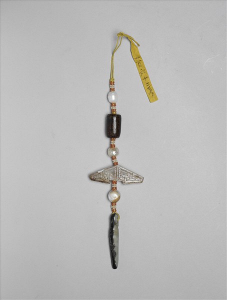 本件為一細長條狀飾件,形似針狀,又似人形,一端較扁,中央有一圓穿,長度約占全器之四分之一;剩下部份一部份較粗,近另一端漸細。全器自沿縱軸分為黑色及淺灰色兩半。全器光素無紋。本件頂端之圓穿繫有黃縧,與故玉9135、故玉9136組成一組佩飾,整組佩飾以三件玉飾為主,並間隔飾以珍珠和米珠。
