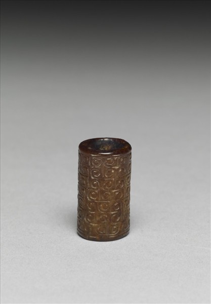 玉管,色澤紅褐,中央有一圓形通心穿,應為穿繫配掛用,本件原始用途可能是佩飾之組件。全器外壁以陰刻與淺浮雕技法雕有回紋,管壁近底部處有邊稜。內壁光素無紋。玉管時代為新石器時代晚期,紋飾應為戰國晚期後加。
