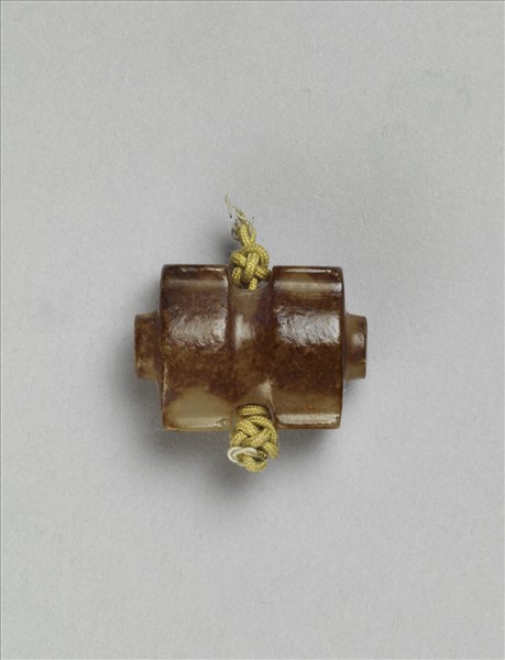 本件是司南形之玉佩飾件,玉質泛赭色,器型自側面觀之呈「工」字形,中央有一橫穿,可供穿繫佩帶。「司南」是古代用於正方向、定南北的工具,類似羅盤;因具有「指引正確方向」之意涵,佩掛於身上,有辟邪之意。本件司南形佩中央貫穿黃縧,穿孔處均打結,由此看來,本件可能原本為整組佩飾之一部份。
