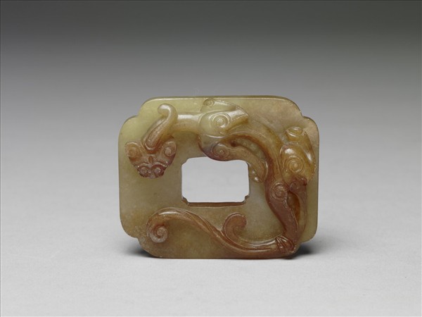 本件呈長方形,外緣四角圓轉內凹,中央有一方形孔,孔之四角圓轉,與本外廓造型相同。本件玉質青黃泛褐色,正面浮雕一螭虎盤繞於中央方孔之外,螭虎身形迴轉,長尾勾起,造型精緻生動。本件背面平坦,光素無紋。