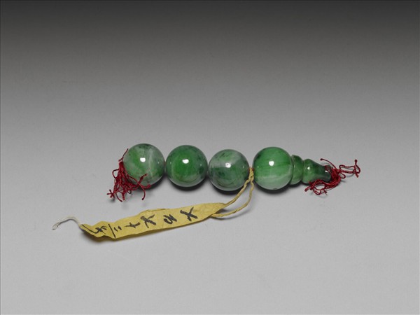 本件由佛頭四粒與佛頭塔一粒以紅縧串成,推測原屬「朝珠」之部份構件。朝珠是清朝帝后大臣命婦穿著朝服或吉服時垂掛於胸前的飾物,由一百零八粒珠貫串而成,每二十七粒珠之間以一粒其他質材之珠區隔,稱為「佛頭」;本件文物中的翠玉珠即為佛頭。通常垂掛朝珠時,頸後方之佛頭下接有一「佛頭塔」,下垂一背雲。本件中的塔狀翠玉即為佛頭塔。本件佛頭與佛頭塔皆色澤翠綠,表面光素無紋。