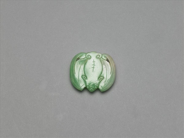 翠玉質鈕扣,玉質綠中泛白,外輪廓雕鏤作蝙蝠造型,鈕扣背面有一橋形鈕穿。此鈕扣雕琢成一垂頭、倒吊、尖耳、展翅之蝙蝠,鈕扣正面並淺刻蝙蝠翅膀與背脊細紋;背面則光素無紋。此蝙蝠紋樣可能是以諧音方式傳達「福到」之吉祥寓意。