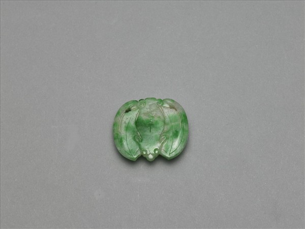 翠玉質鈕扣,玉質綠中泛白,外輪廓雕鏤作蝙蝠造型,鈕扣背面有一橋形鈕穿。此鈕扣雕琢成一垂頭、尖耳、倒吊、展翅之蝙蝠,鈕扣正面並淺刻蝙蝠翅膀與背脊細紋;背面則光素無紋。此蝙蝠紋樣可能是以諧音方式傳達「福到」之吉祥寓意。