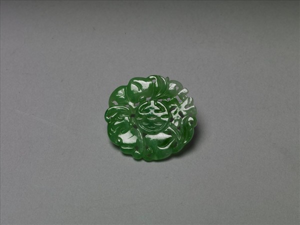 翠玉質鈕扣,玉質綠中泛白,正面鏤雕紋飾,中央為團壽紋,團壽紋左右鏤雕卍字一個與蝙蝠一隻,上下均鏤雕桃實與枝葉紋,整組紋飾寓意「福壽萬年」。鈕扣背面光素無紋,有一橋形鈕穿。