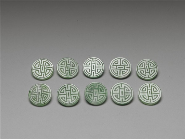 此圓鈕以翠玉製成,玉質綠中泛白,背後有一圓形鈕穿。鈕的正面深刻一團壽紋。