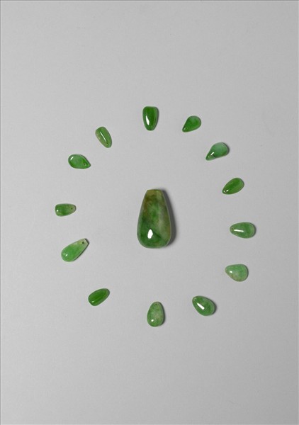 十四個水滴狀的翠玉玉塊(故玉9233-9246),一件體積較大,其他十三件大小相仿。這些玉塊在寬度較窄的頂端皆有細小孔洞,可供穿繩墜飾,或本為朝珠、數珠、水串等佩飾的配件。